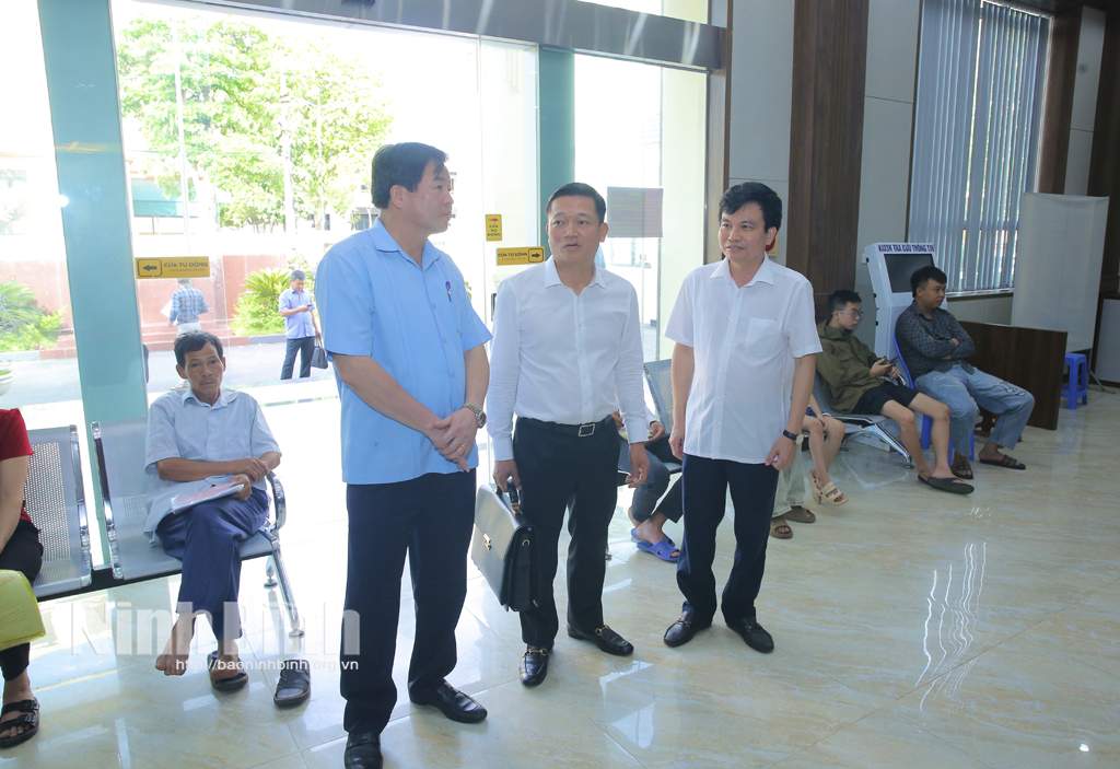 Đoàn kiểm tra thực tế hoạt động tại bộ phận tiếp nhận và trả kết quả huyện. Ảnh: Đức Lam Tại buổi làm việc, lãnh đạo huyện Kim Sơn đã báo cáo công tác chuẩn bị cho việc vận hành đơn vị hành chính cấp xã mới.